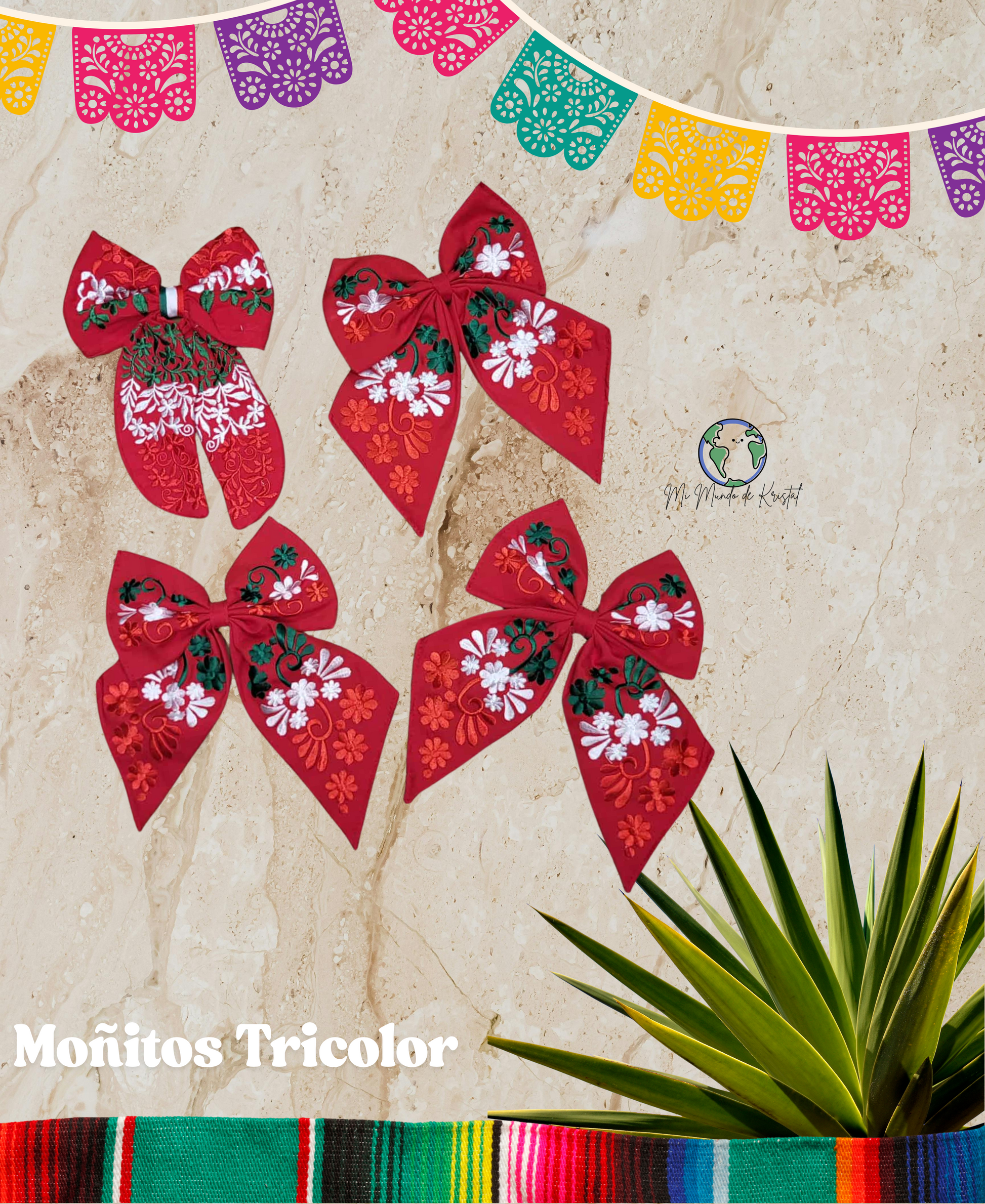 Add a festive touch to your look with our Moñitos Tricolor — handmade bows embroidered with the proud colors of Mexico 🇲🇽. Each bow is crafted with care, showcasing intricate floral designs that highlight artisan detail and cultural pride.